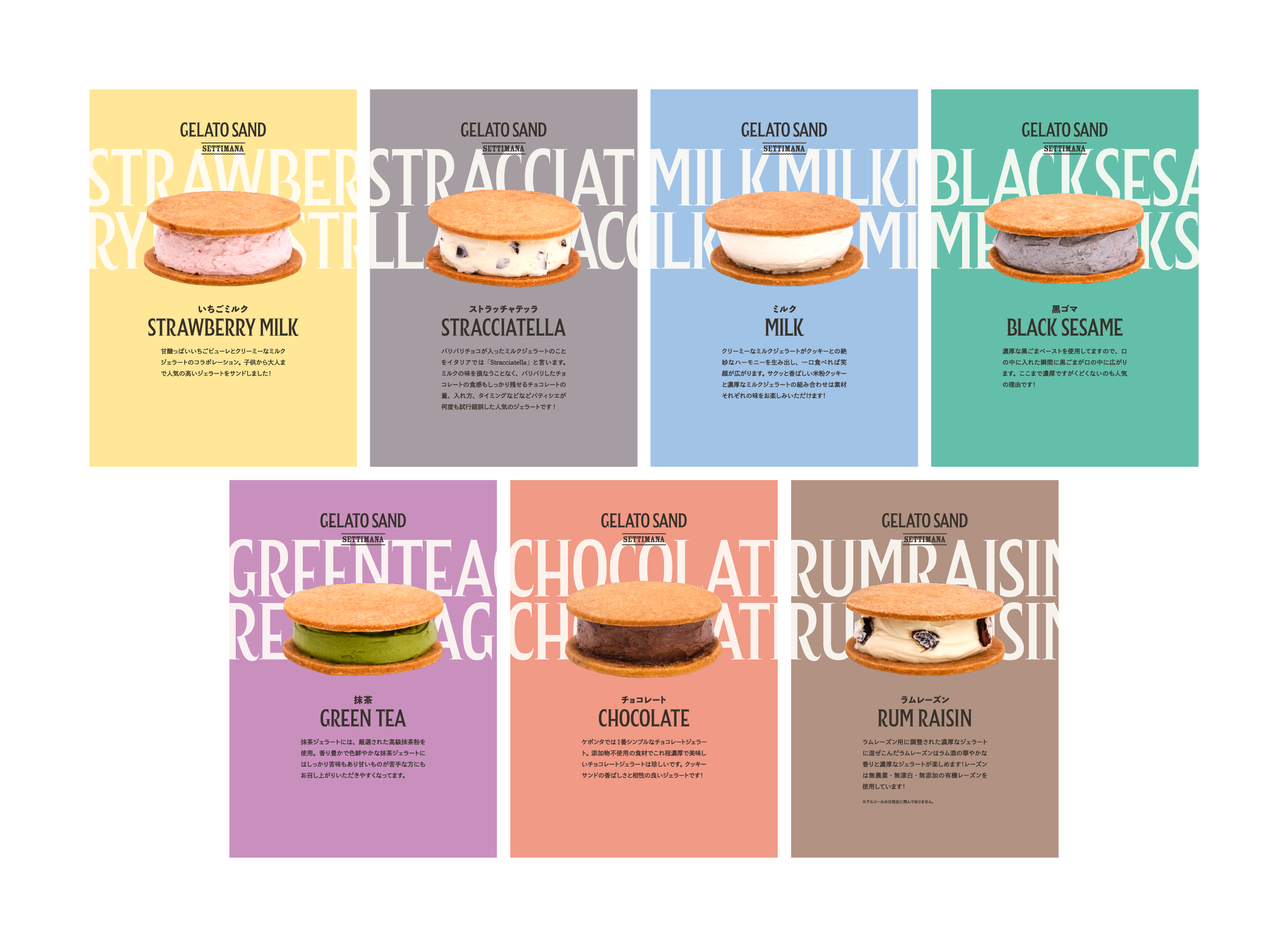 SETTIMANA」はイタリア語で「一週間」という意味。7つのフレーバーを、服を選ぶような感覚で楽しんでほしい、という想いを込めて制作しました。楽しげな中にもどこか懐かしいイタリアの雰囲気を感じさせる色や書体を選定しています。このジェラートサンドたちがあなたの毎日のちょっとした楽しみになりますように。